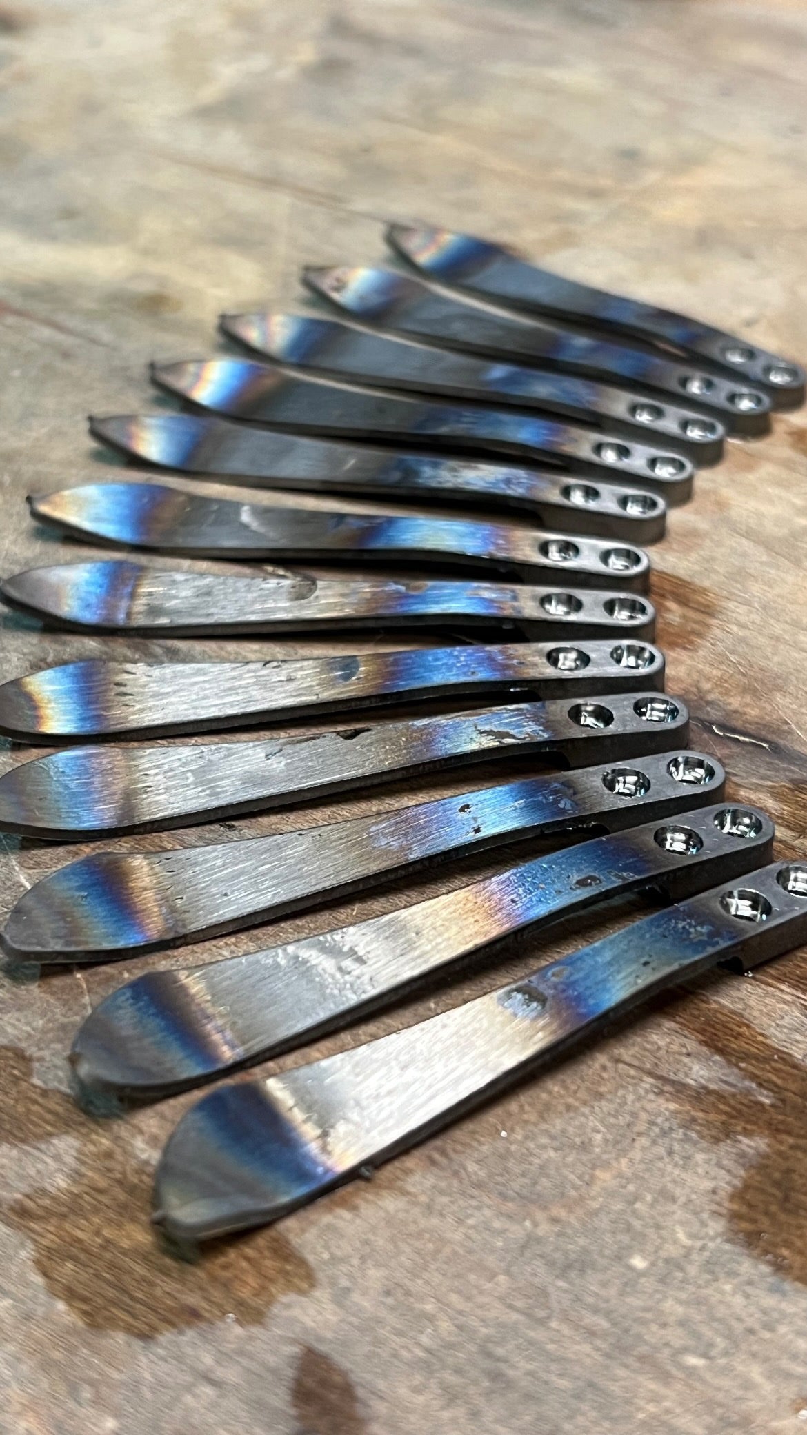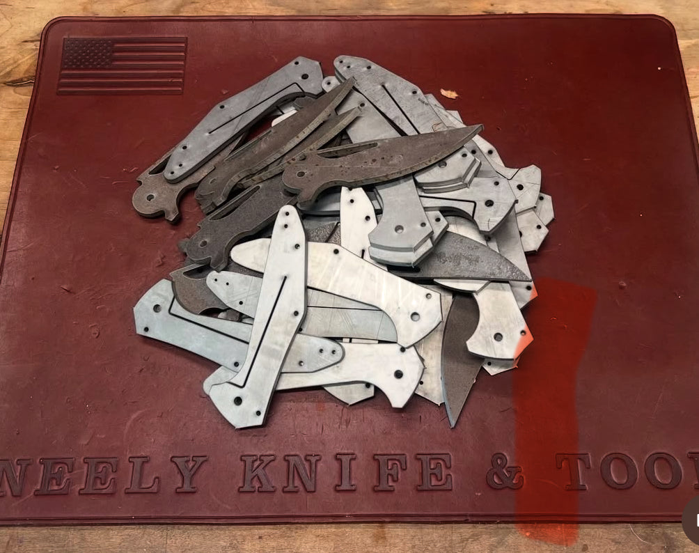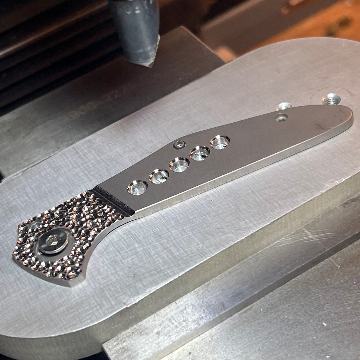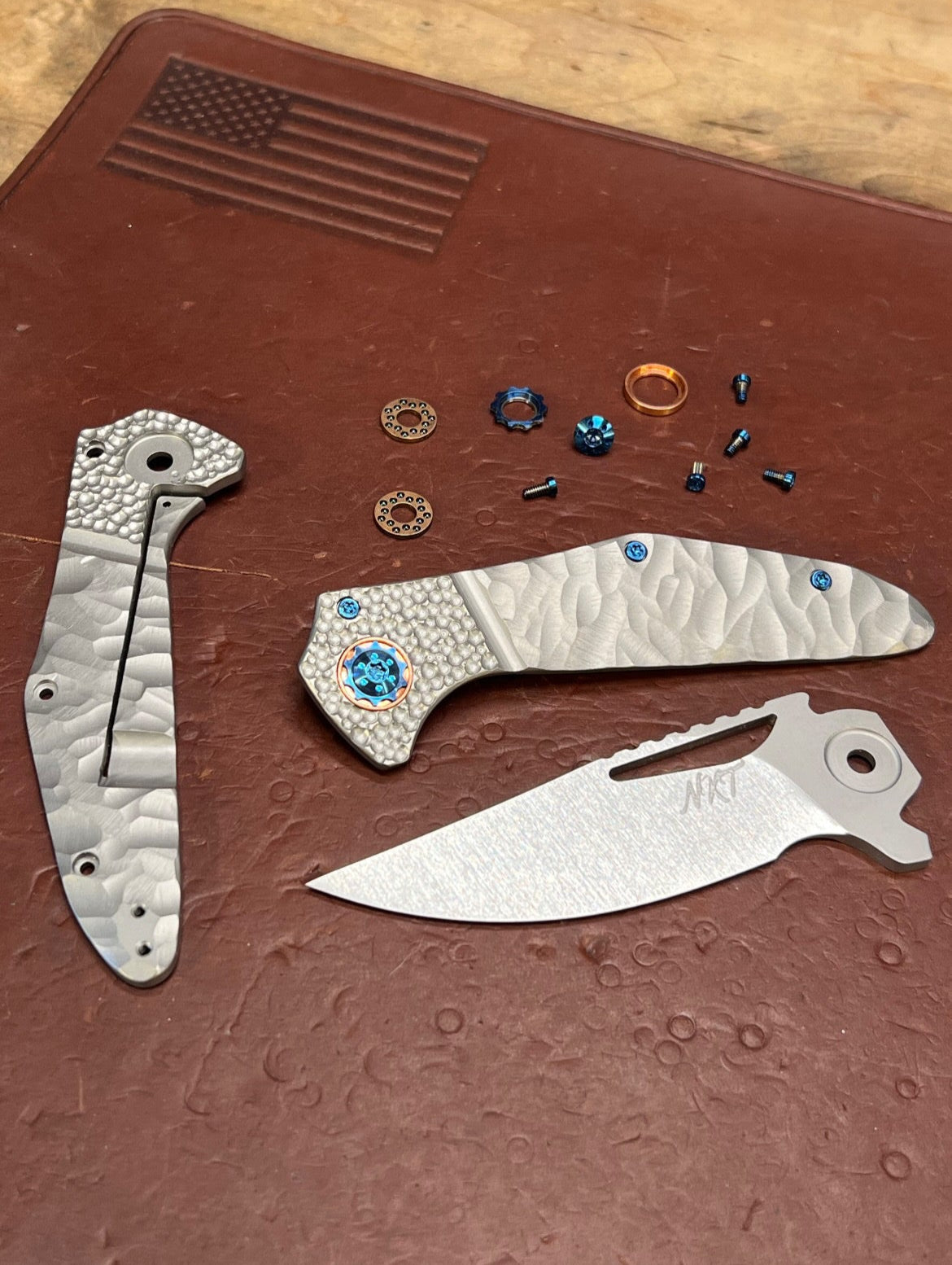 The 6al-4v titanium frames, pocket clips and CPM Magnacut stainless bladesteel all arrive in their raw form, having the profiles and pilot holes water-jet cut, ready for machining.