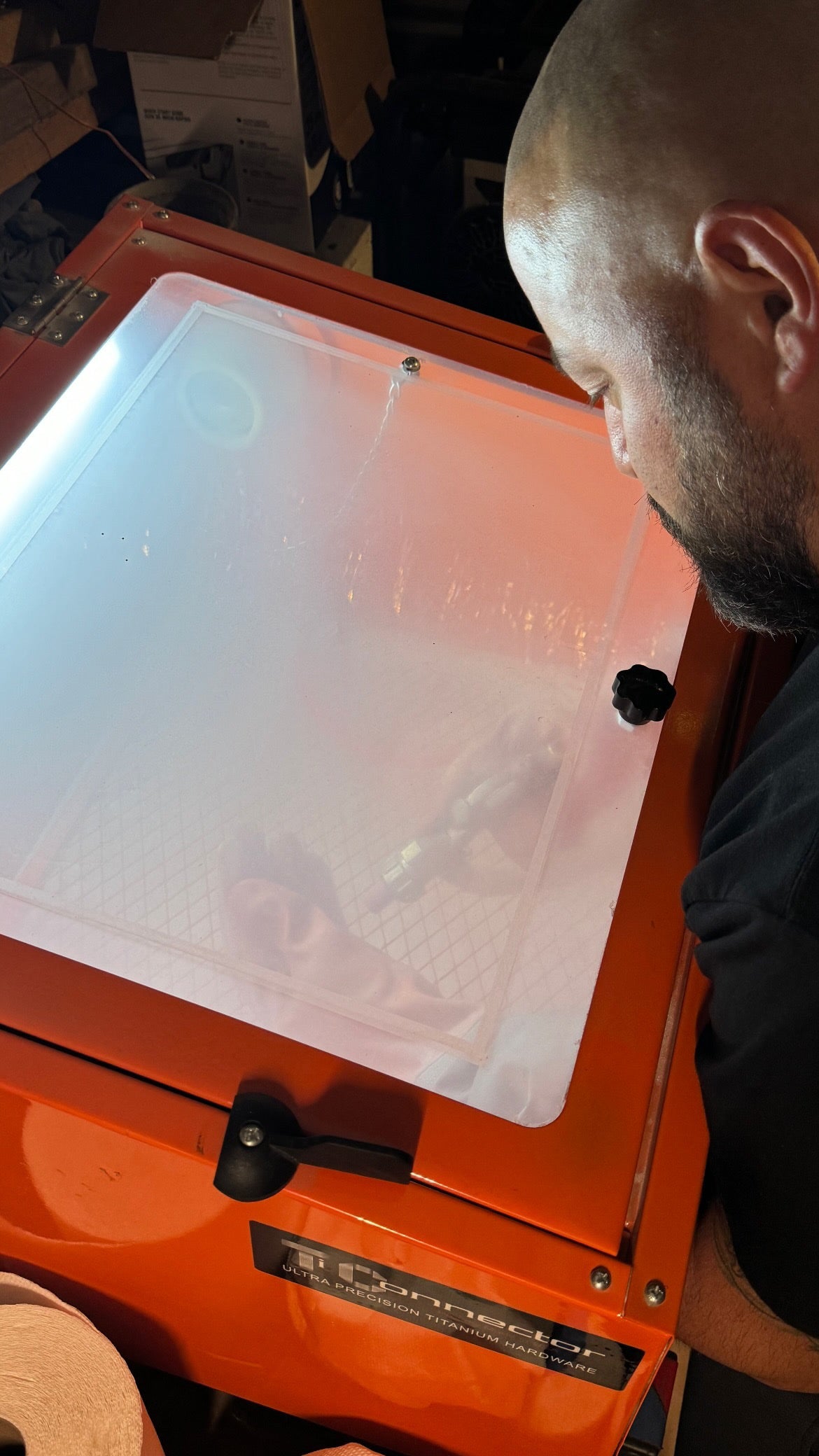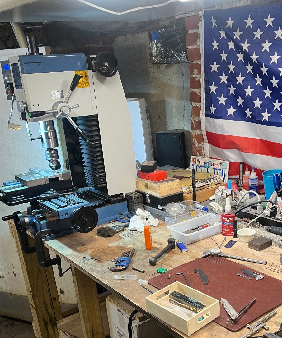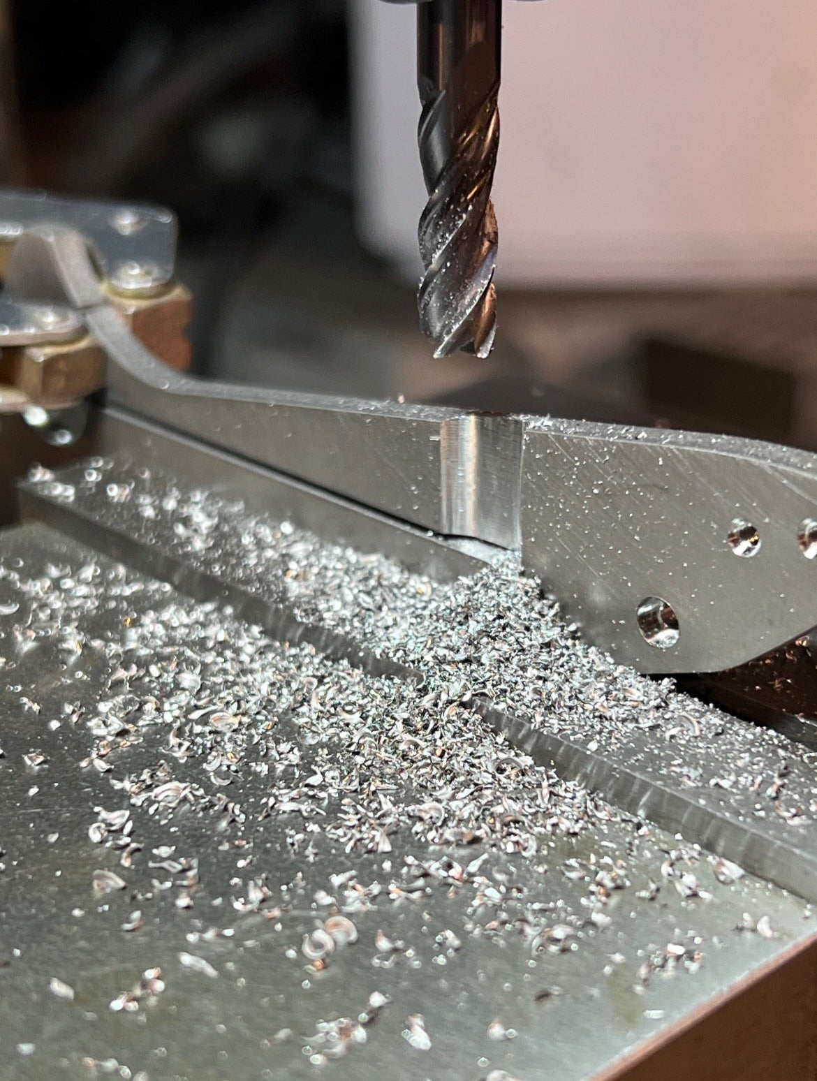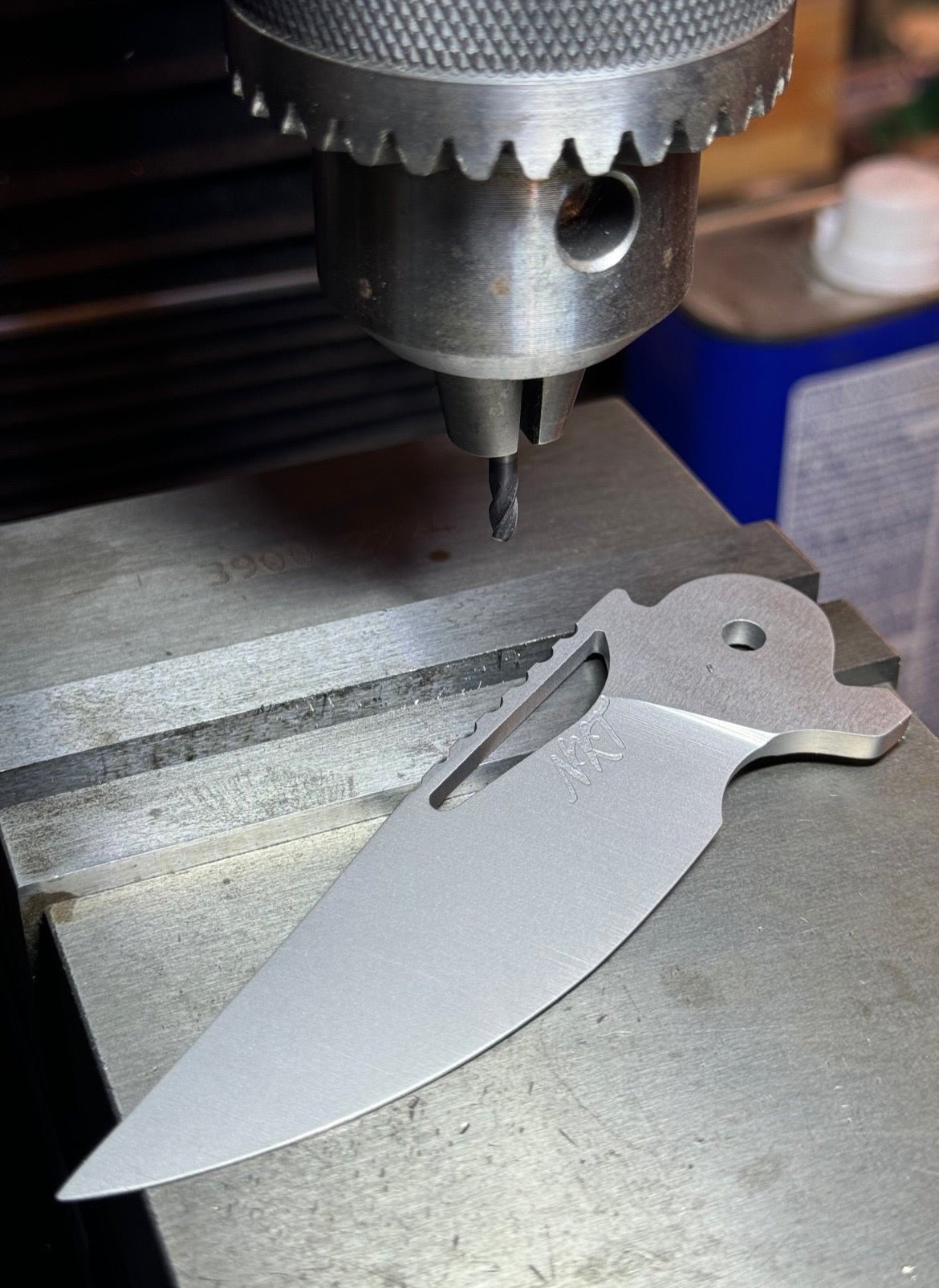 The 6al-4v titanium frames, pocket clips and CPM Magnacut stainless bladesteel all arrive in their raw form, having the profiles and pilot holes water-jet cut, ready for machining.