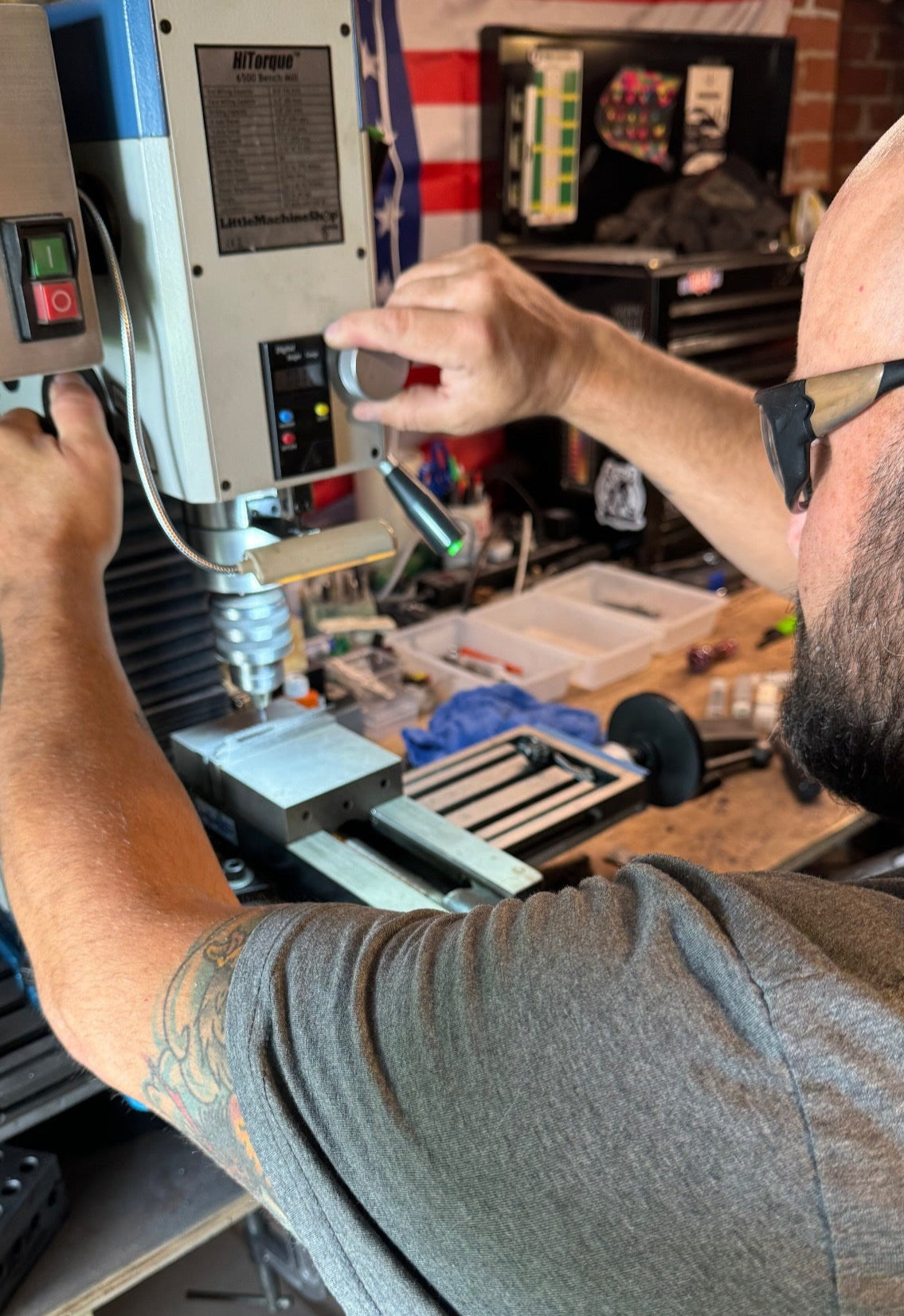 All of the titanium frame scale features are manually machined with precision and tight tolerances. Then the profiles, flats and chamfers are ground by hand prior to being bead blasted to a smooth, satin finish.