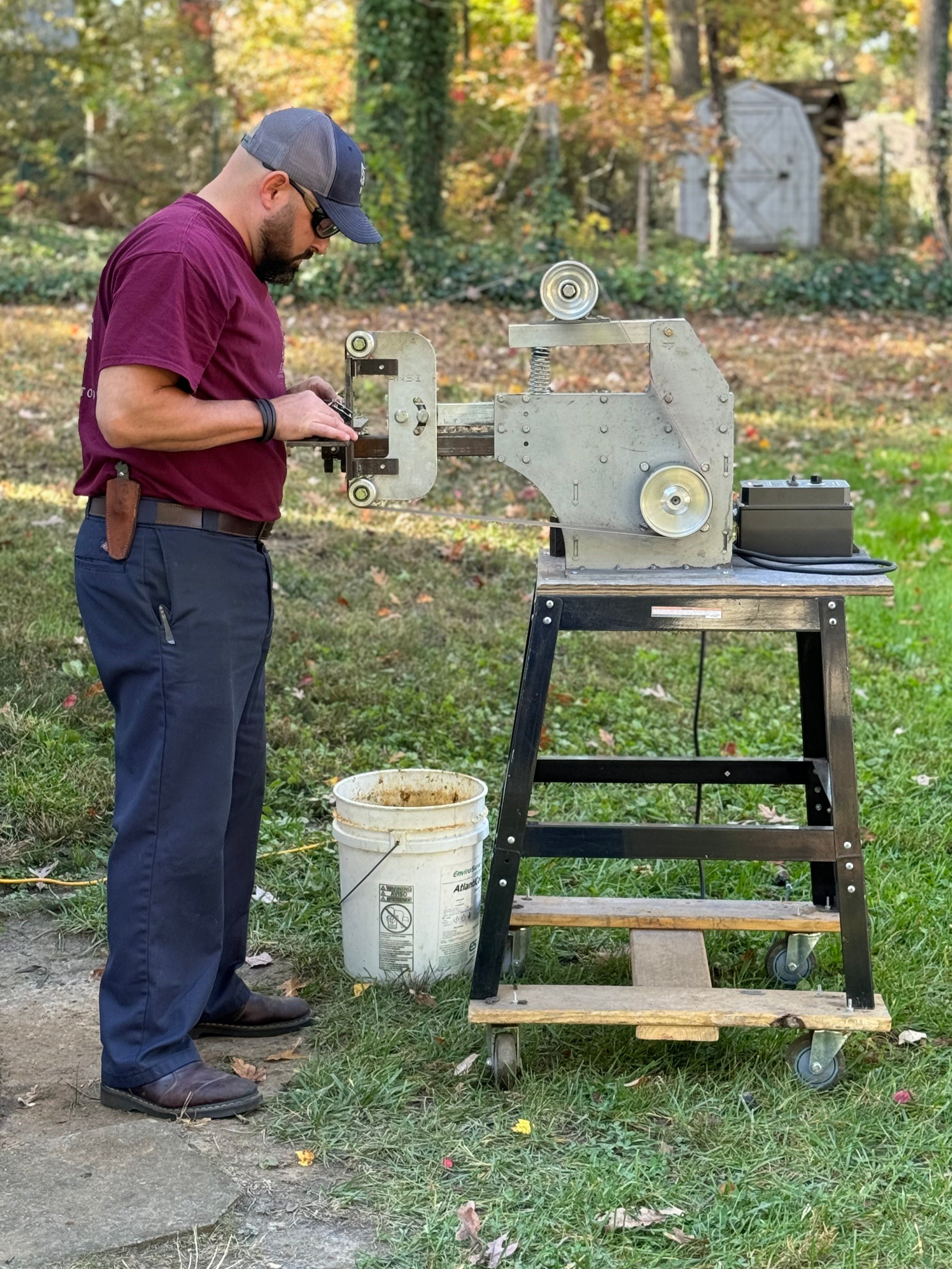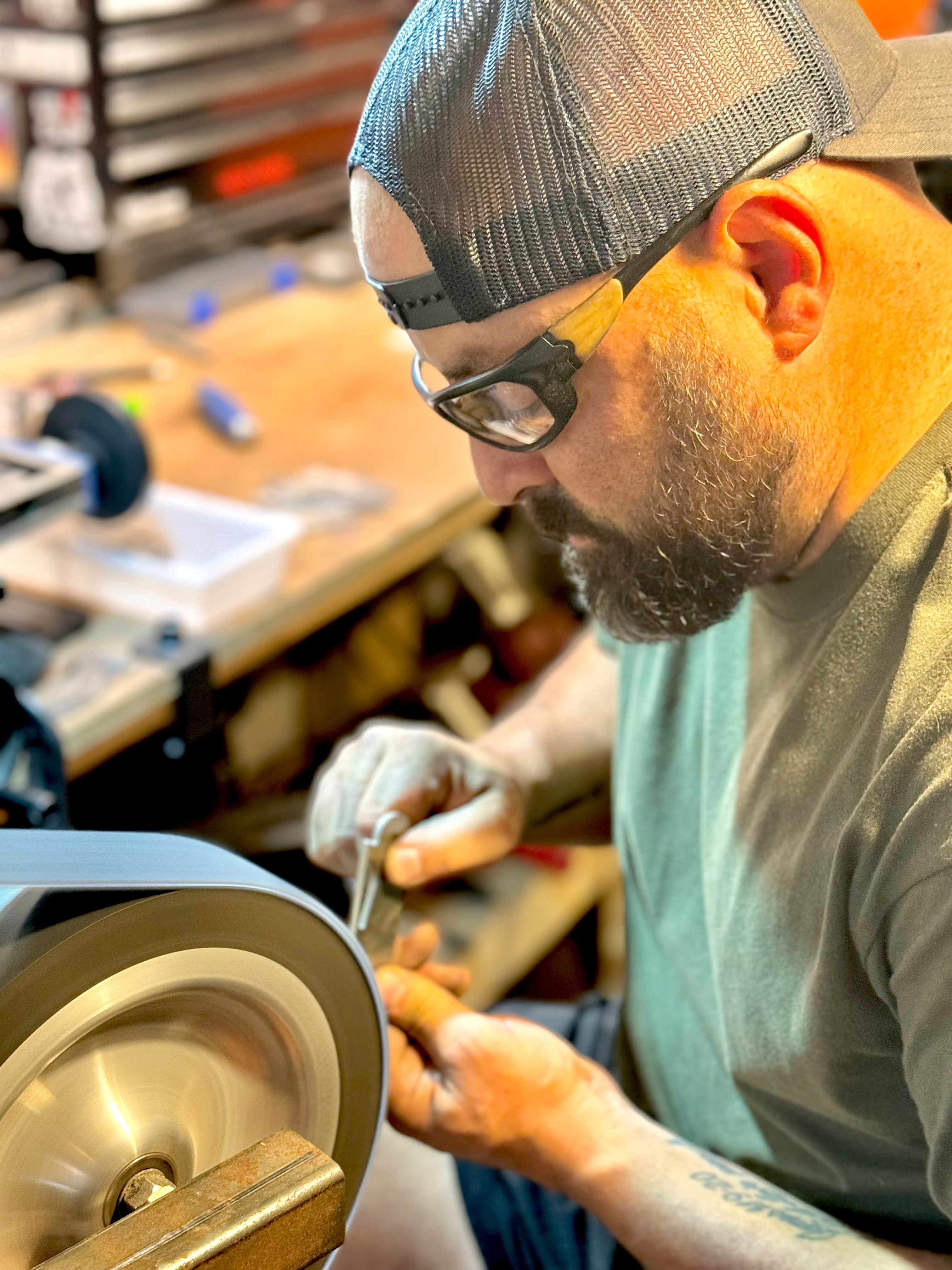 Each blade is surface ground for flatness, manually machined, the bevels rough ground to 120 grit and finally, sand blasted. After being professionally heat treated, the blades are then bead blasted and once again, ground by hand to a 220 grit full height gorgeous, belt satin finish.